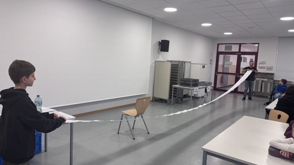 Im weiteren Verlauf erkannten die Kinder Symbole verschiedener Apps und setzten sich kritisch mit deren Funktionen und Altersfreigaben auseinander. Besonders eindrucksvoll war eine Demonstration, bei der gezeigt wurde, wie umfangreich die Nutzungsbedingungen von WhatsApp sind und dass diese häufig ungeprüft akzeptiert werden. Zur Auflockerung bearbeiteten die Schülerinnen und Schüler in Kleingruppen eine kleine WhatsApp-Challenge.