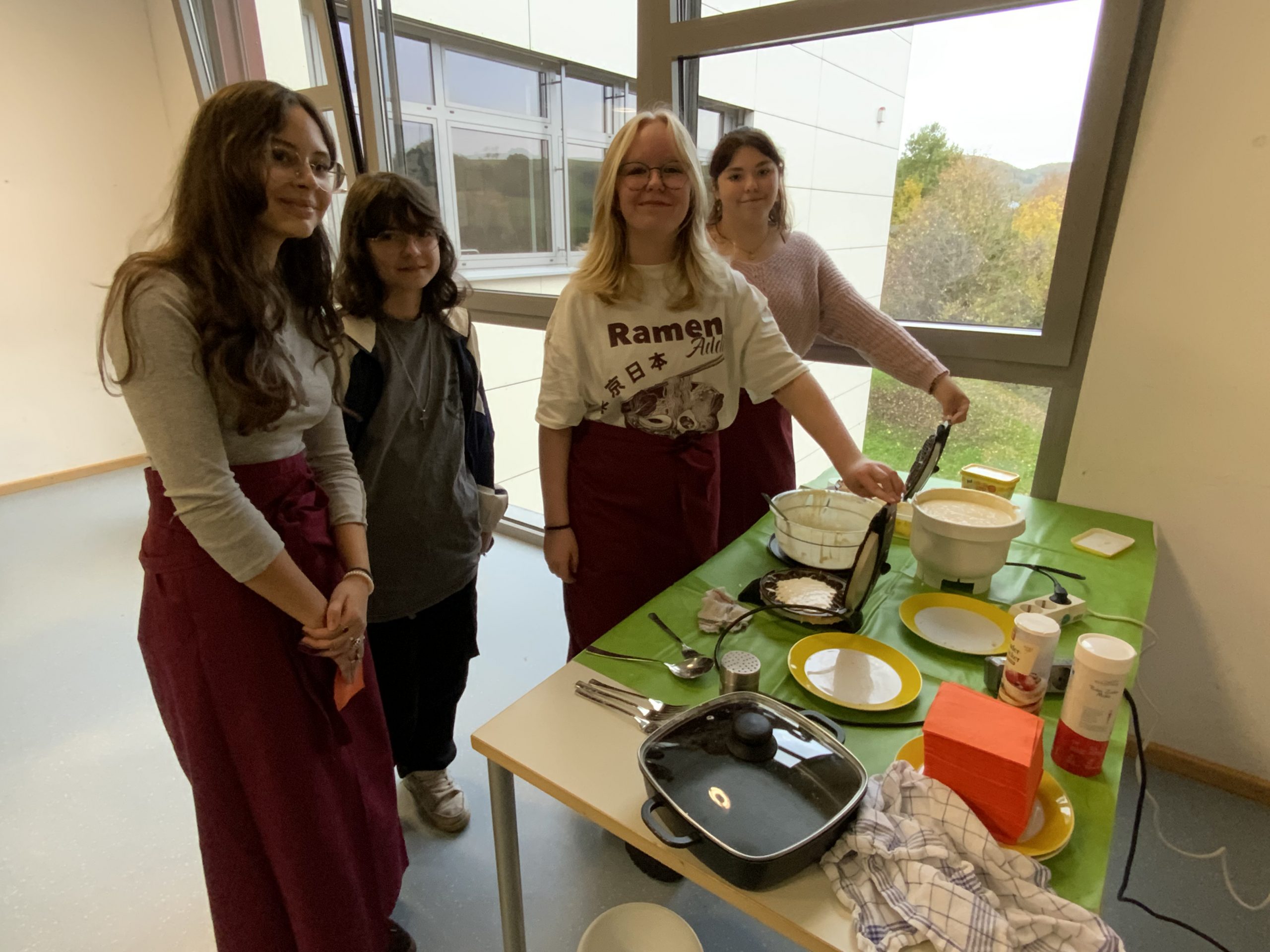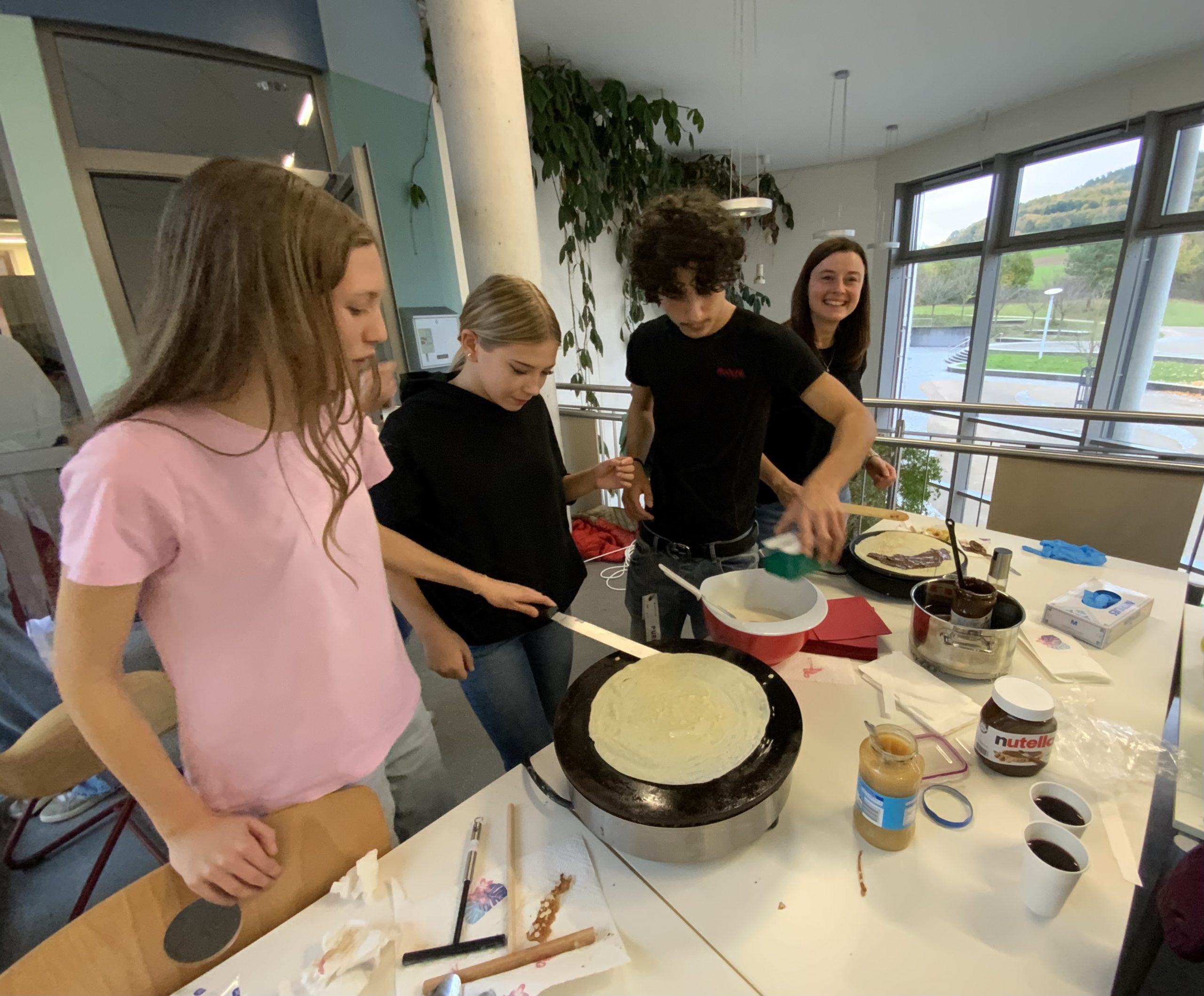 Der Duft von Punsch mischte sich mit zarten Crepes, die die Klasse 9a zubereitete und an die Besucher verkaufte. Die Candy-Bar der Klasse 9b war ein beliebter Anlaufpunkt für Naschkatzen und trug mit farbenfrohem Angebot zur ausgelassenen Atmosphäre bei. Ein besonders großes und reichhaltiges Kuchenbuffet, das der Schulsanitätsdienst organisierte, zog ebenfalls viele Gäste an und bot in der Aula eine vielfältige Auswahl. Getränke verkaufte das Team der SMV an die durstigen Gäste.
