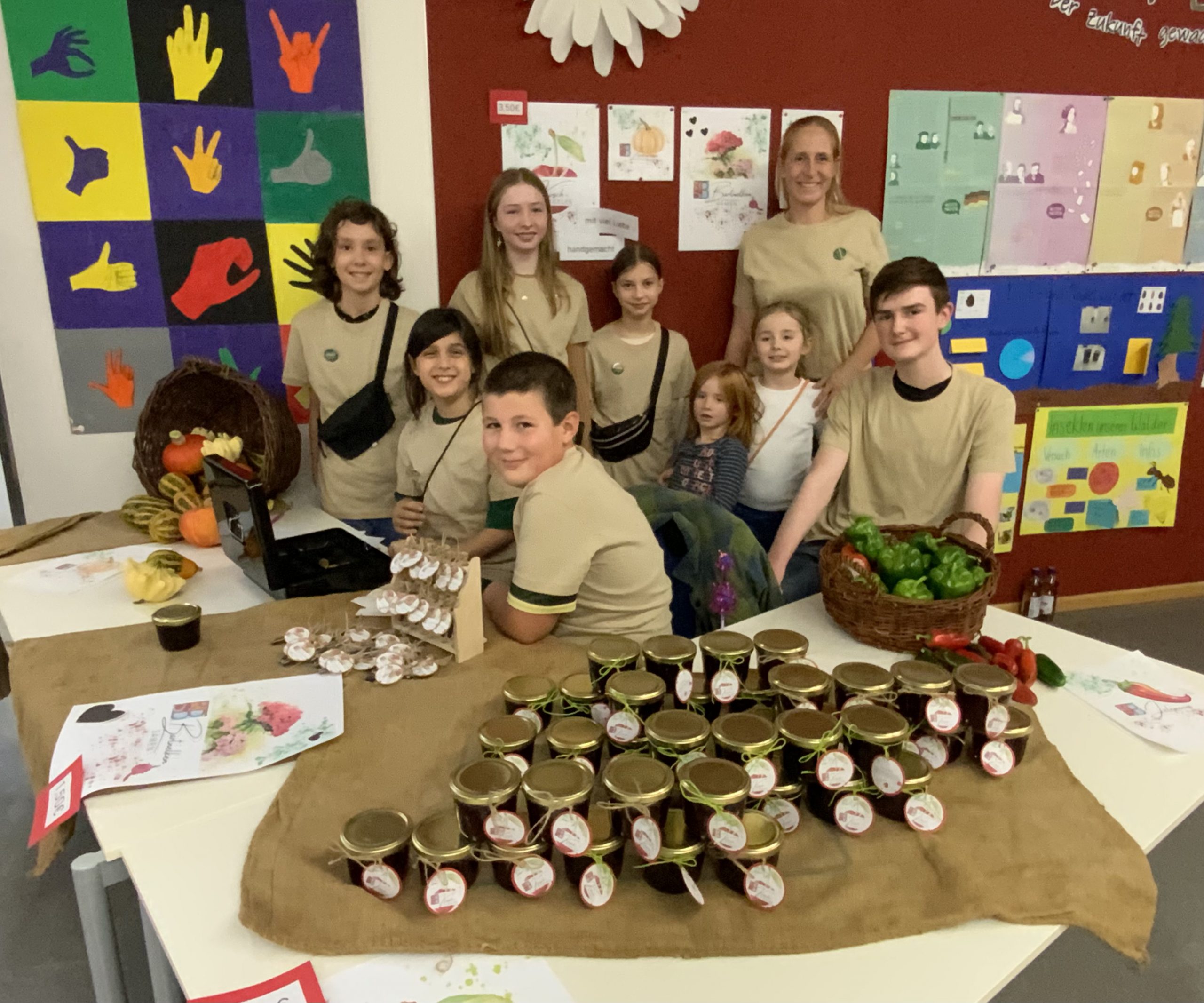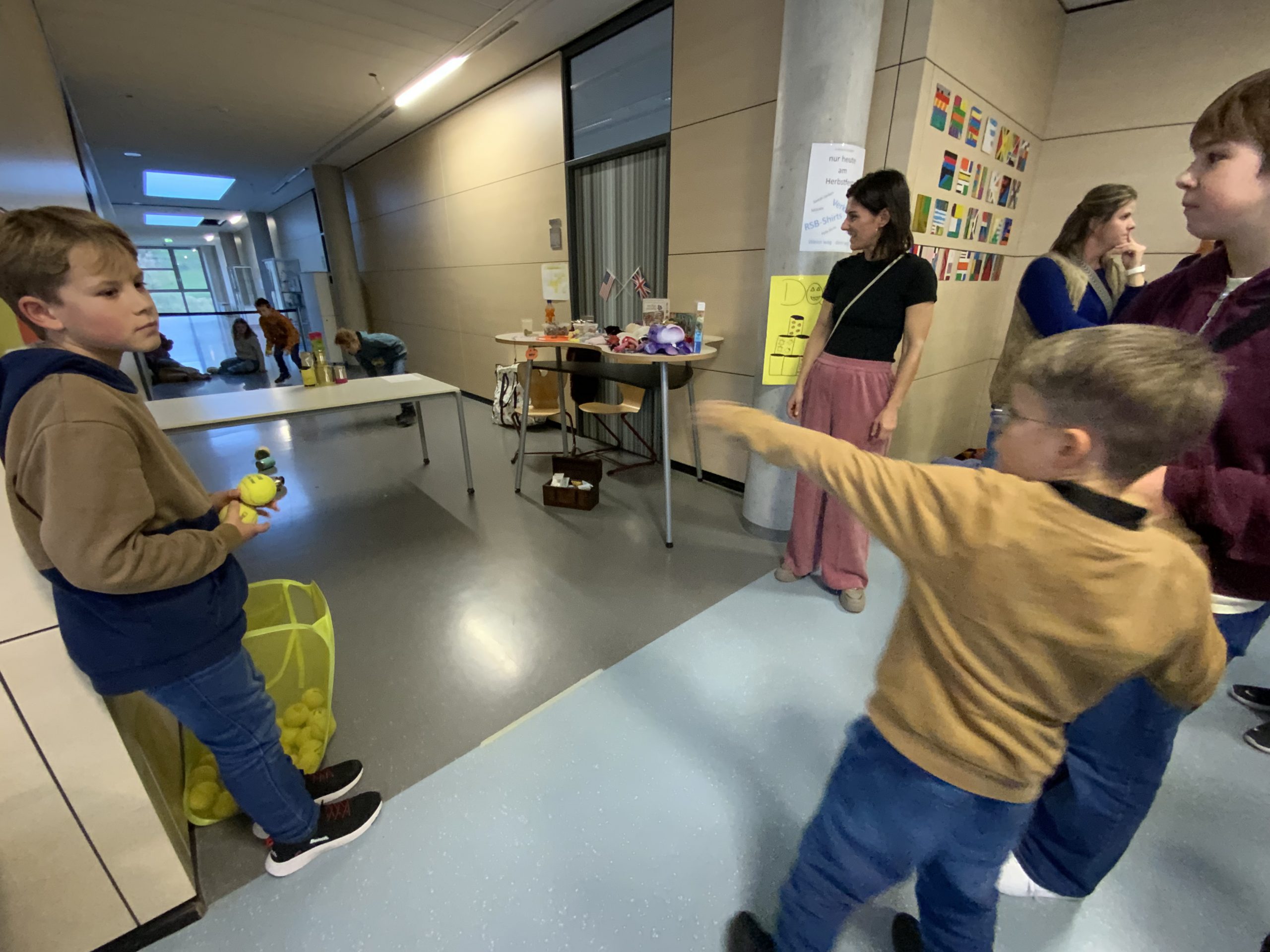 Im Obergeschoss herrschte reges Treiben bei der Dosenwerfen-Aktion der Klasse 5c, die mit einem spielerischen Wettkampf viel Ehrgeiz hervorrief. Daneben betreuten die Mediencoaches mit Unterstützung einiger Schülerinnen der 7. Klassen eine Backstation, an der Waffeln frisch zubereitet und verkauft wurden – ein süßer Duft zog durch das Gebäude und lockte viele Besucher an. Ebenso begeistert bot die RSB-AG Schulgarten liebevoll verpackte Samen, selbst eingekochte Marmelade und Gemüse (alles aus dem Eigenanbau!) zum Verkauf an, wodurch Spenden für den Schulgarten und gleichzeitig das Bewusstsein für nachhaltige Projekte gefördert wurden.