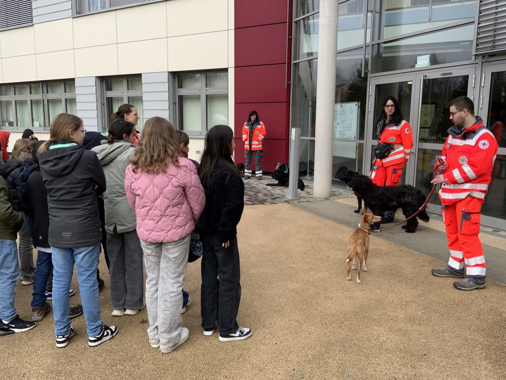 Diese beson­dere Unter­richts­stunde machte deut­lich, wie viel Enga­ge­ment, Zeit und Leiden­schaft hinter der Arbeit der Rettungs­hun­de­staffel steckt. Für die Schü­le­rinnen und Schüler war es ein eindrucks­volles Erlebnis, das sicher­lich noch lange in Erin­ne­rung bleiben wird. Wir bedanken uns ganz herz­liche bei dem Team der Rettungs­hun­de­staffel Aschaf­fen­burg für ihren Besuch.