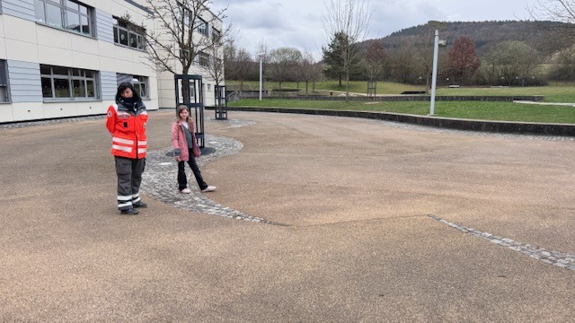 Der Höhe­punkt des Besuchs ließ nicht lange auf sich warten: die prak­ti­sche Vorfüh­rung. Zwei mutige Kinder versteckten sich auf dem Schul­ge­lände, während die Hunde Atze und später auch Glenn, ein Labrador Retriever, konzen­triert die Suche aufnahmen. Gespannt verfolgten die Klassen, wie ziel­strebig die Tiere sich allein mit ihrem ausge­prägten Geruchs­sinn orien­tierten. Schon nach kurzer Zeit meldeten sie mit lautem Bellen den Erfolg – die „Vermissten“ waren gefunden. Die Begeis­te­rung war groß. „Für die Hunde ist das keine Arbeit, sondern ein span­nendes Spiel“, erklärte Frau Weis.