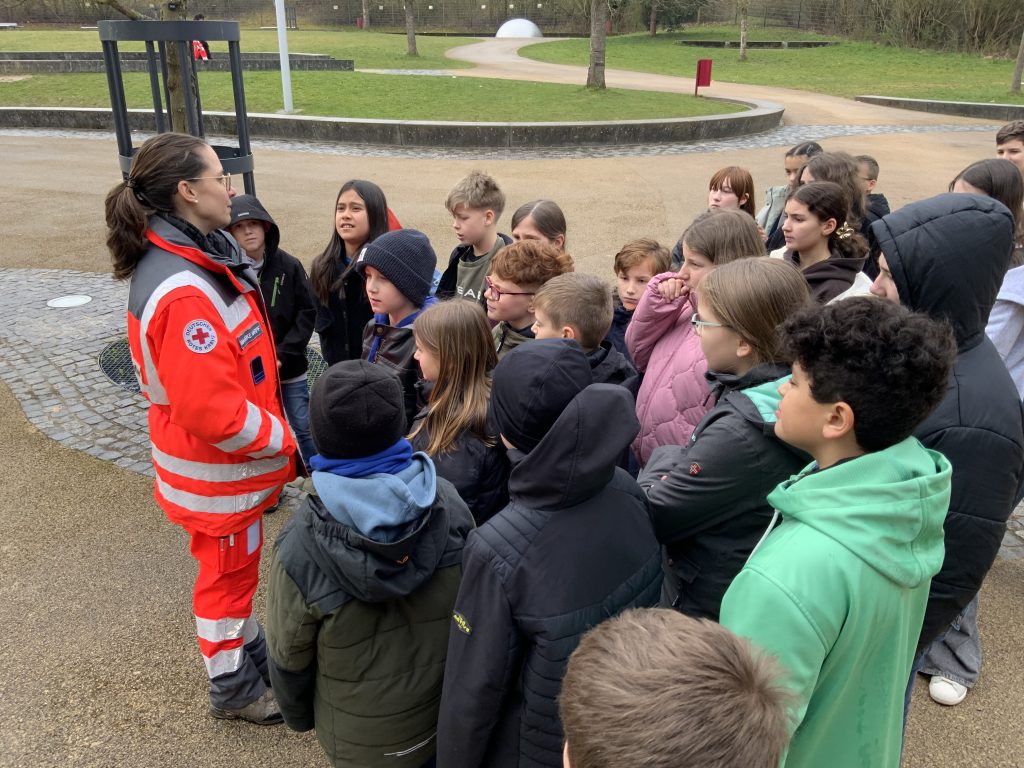Schon bei der Ankunft war die Begeis­te­rung groß: Mit freund­li­chem Gebell begrüßte Rettungs­hund Atze die neugie­rigen Kinder. Nachdem sich alle mitein­ander vertraut gemacht hatten, stellte Frau Mareike Karpf, die Vorsit­zende der Staffel, gemeinsam mit ihrem Team – Frau Tamara Bach­mann, Frau Ange­lika Weis und Herrn Sebas­tian Bach­stein – ihre wich­tige Arbeit vor. In ihren auffäl­ligen oran­ge­far­benen Einsatz­uni­formen berich­teten sie anschau­lich aus ihrem Alltag.