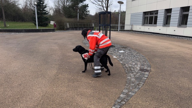 Anschlie­ßend zeigte Hündin Ronja ihr Können als soge­nannter Mantrailer. Mithilfe eines Geruchs­ge­gen­stands nahm sie die Spur einer versteckten Schü­lerin auf und führte ihre Trai­nerin sicher zum Ziel. Der Applaus der Zuschauer war ihr sicher.