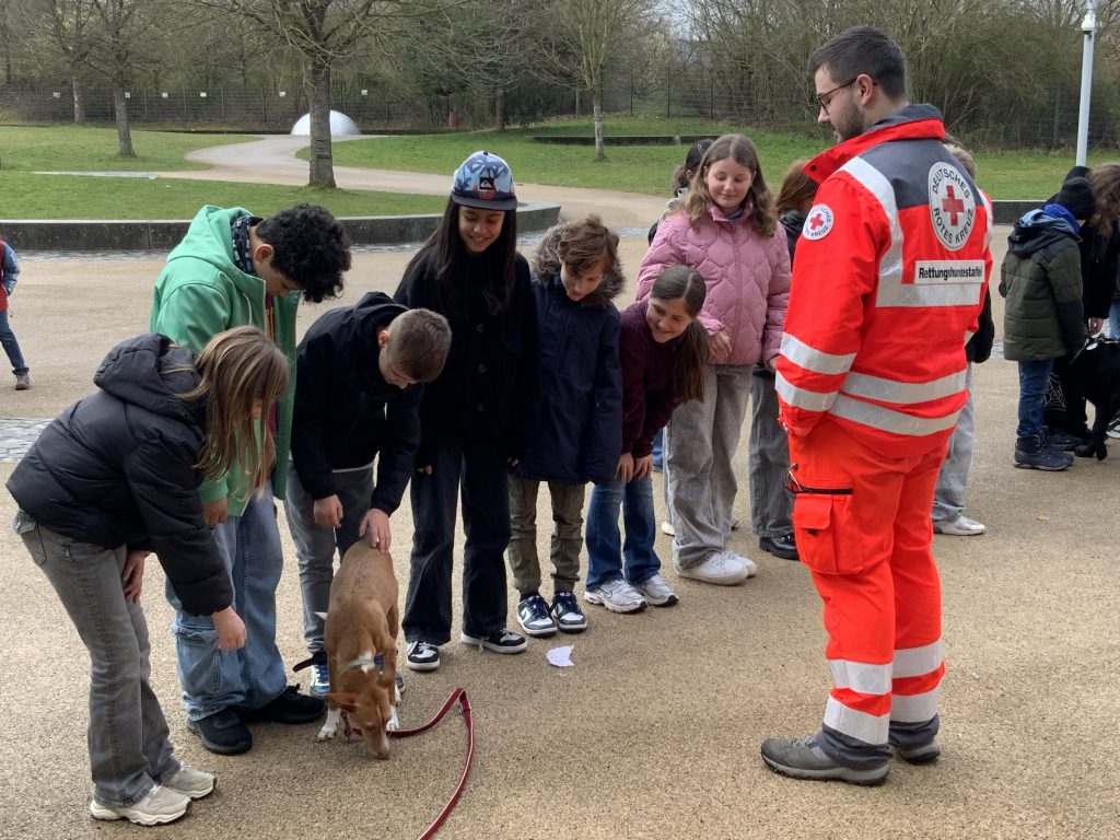 Welche Eigen­schaften braucht ein Hund, um Menschen in Not zu helfen? Dieser span­nenden Frage gingen die Schü­le­rinnen und Schüler der Klassen 5a, 5b und 5c im Biolo­gie­un­ter­richt nach – und erhielten dabei ganz beson­dere Unter­stüt­zung auf vier Pfoten. Am 17. März 2026 besuchte die Rettungs­hun­de­staffel des BRK Aschaf­fen­burg erneut die Real­schule Bessen­bach und sorgte für einen ebenso lehr­rei­chen wie leben­digen Vormittag.